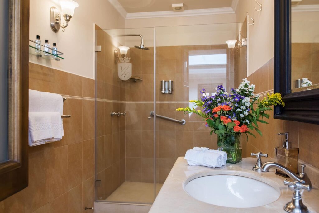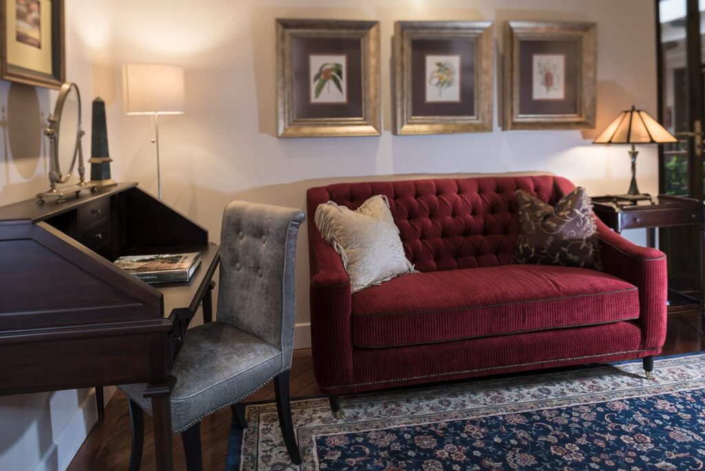 This suite is located on the upper floor. It features three large colonial windows, a large, comfortable sitting room with two couches and a writing desk, and a large bathroom, with rain shower. It also has a 49 inch flatscreen HD Smart TV with Netflix.
