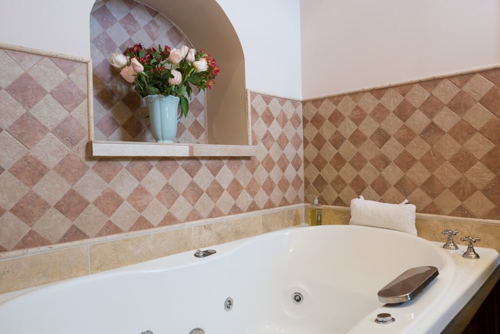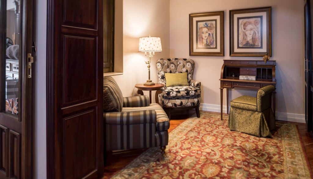 This large suite is located on the lower floor and has a queen bed and lots of closet space. The large sitting area features two overstuffed armchairs, colorful rugs and a writing desk. In the bathroom, in addition to rain and Swiss showers, there is a jacuzzi tub. It also has a 56 inch flatscreen HD Smart TV with Netflix.